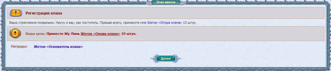 ♦ Для доступа в регистратуру кланов нужно или пройти квест «Основание клана», или уже состоять в клане. Но так, как нас интересует создание клана, то нам нужно пройти квест «Основание клана». Квест доступен с 10-го уровня в столицах империй у администратора Жу Линь